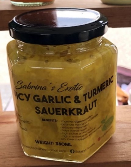 Sabrina’s delectable Spicy Garlic & Tumeric SauerkrautIn the local grocery sector SMEs have recognized the urgency of digital adoption to remain competitive and propel business growth with technology. However, most have not taken the plunge, challenged by factors such as their lack of in-house techskills and the potentially high costs. Sabrina Nicholls is an agri-processor of specialty sauces, jams, jellies and chutneys (a spicy condiment made of fruits or vegetables, originating in India). She is also a vendor at the National Agricultural Marketing and Development Corporation (NAMDEVCO) Farmers’ Market. Sabrina uses local fruits and vegetables to create a range of delicious products that would appeal to both local and international markets. Her products, all attractively packaged, range from Eggplant Amchar (a mixture using many of the spices used in Indian pickling) and Coconut & Tamarind Chutney to Probiotic Pickled Beets and Spicy Garlic & Turmeric Sauerkraut. A chef by training, Sabrina’s culinary background has exposed her to many cultures, foods, and methods of food preparation which she uses in the production of some items like her Caribbean Kimchi, which merges international cuisine with local bok choy, chayote, and cabbage to create a delicious, exotic, explosion of flavors and cultures all in one bottle.