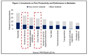 Firms’ access to finance is hindered by a lack of credit risk information, as well as increasingly stringent KYC and other institutional constraints. Barbados ranked 144th out of 190 countries on the World Bank’s 2019 Doing Business Report indicator for ‘getting credit’, in part reflecting the lack of a credit bureau or centralized information regarding counterparty credit risks. This contributes to burdensome collateral and other security requirements for firms—particularly for smaller ones.