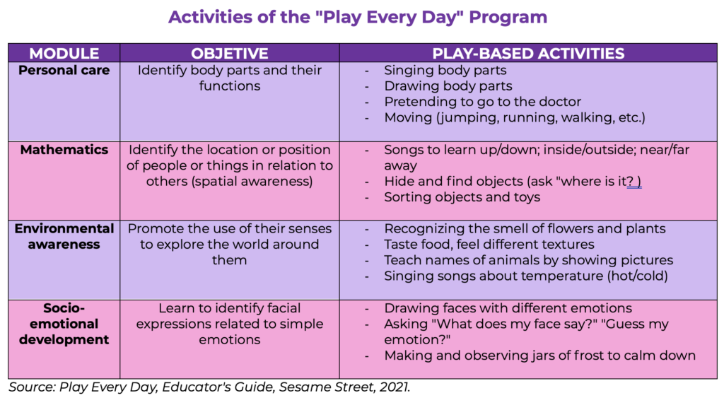 The model was based on Sesame Street's "Play Every Day" program and aimed to promote the development of cognitive and socioemotional skills of children between a few weeks and 47 months of age through child-caregiver play.