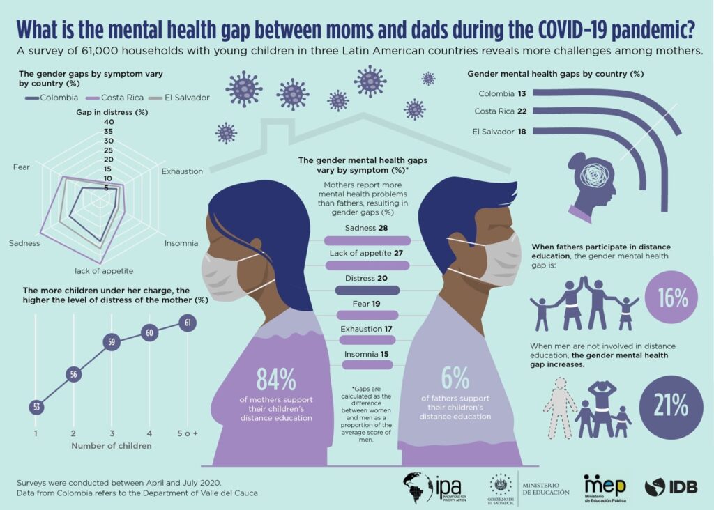 This infographic won the award for ‘Best Visualization Contest: COVID-19, a pandemic with many realities’ that had the purpose of showing inequality and its manifestations during the pandemic in Latin America and the Caribbean.The levels of distress are particularly elevated among mothers of young children who shoulder the bulk of the burden of supporting children’s distance education (84%). The pursuing gender gaps in mental health outcomes are troubling, including gender gaps in sadness (28%), lack of appetite (27%), overall distress (24%), fear (19%), exhaustion (17%) and insomnia (15%).