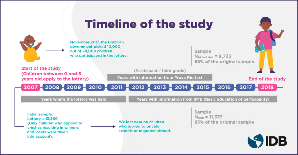 Although the Brazilian government had established free access to public childcare centers as a fundamental social right, in practice not enough places were available to fully meet the demand, in fact, in the low-income neighborhoods of Rio de Janeiro, there were only 244 crèches –the name by which these childcare centers for children from 0 to 3 years of age are known in Brazil. Then, in places where the number of available places was less than the number of applications, the municipal government agreed to implement a lottery to allocate the available vacancies. Thus, 10,000 of the 24,000 children who applied for the 2008 period were selected at random. This is where the timeline begins for the purposes of the research, where two groups were studied: the treatment group (lottery winners) and the control group (losers).