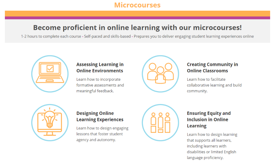 1. ISTE Microcourses: Four asynchronous, 2-hour courses addressing topics such as teaching special populations including students with special needs and English language learners, designing impactful instructional experiences, building community and nurturing relationships, and providing formative feedback and assessment.