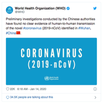 On January 14, the WHO posted what has now been dubbed as an infamous tweet stating there was no clear evidence of human-to-human transmission of the (then) novel coronavirus. See tweet by @WHO: