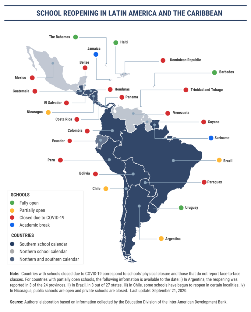 More than six months have passed since the first case of COVID-19 was confirmed in Latin America and the Caribbean. To date, 16 out of 26 countries in the region are keeping their schools physically closed and without reports of face-to-face classes in the near future. While the educational systems that operate with a northern calendar are preparing for the start of the 2020-2021 school year, schools’ physical reopening has become one of the most recurrent themes on educational policy agendas.