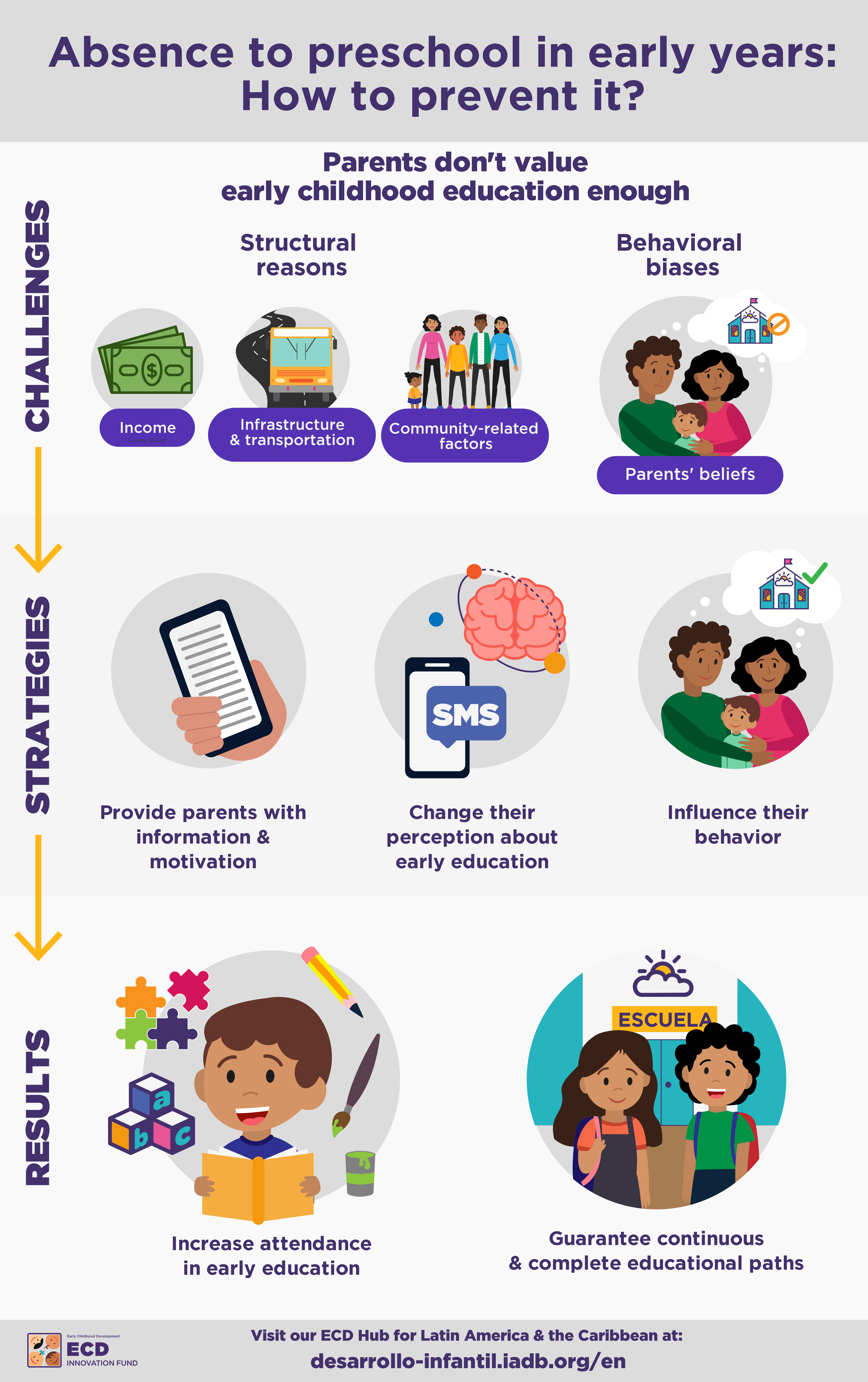 These examples help us understand the two most common reasons children in Latin America and the Caribbean miss preschool days. On the one hand, we find structural reasons, associated with the context of the child (e.g. income, infrastructure, transportation, factors related to the community, among others); this is the case of Camila. On the other hand, we find reasons associated with behavioral biases, where the parents’ beliefs play a decisive role in whether or not the student goes to preschool; this is Carlos’s case. These reasons are not mutually exclusive, but separating them helps us to better understand structural and behavioral barriers.