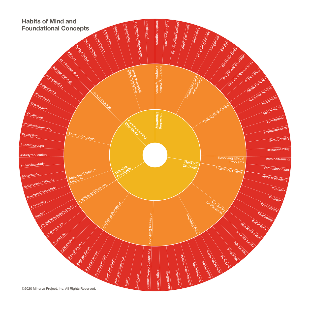 Minerva identifies four core competencies: critical thinking, creative thinking, effective collaboration, and effective interrelation. To teach these core competencies, we break them down into “habits of mind” and “foundational concepts.” “Habits of mind” include cognitive skills that will become automatic with the right triggers. “Foundational concepts“ include broadly applicable fundamental knowledge. All of the four core competencies draw on both types. For example, we can break down effective interrelation to several habits of mind and foundational concepts. These habits and concepts will become the learning objectives for each class: