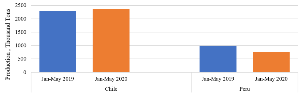 Copper Production Jan-May 2019 vs 2020, Thousand Tons