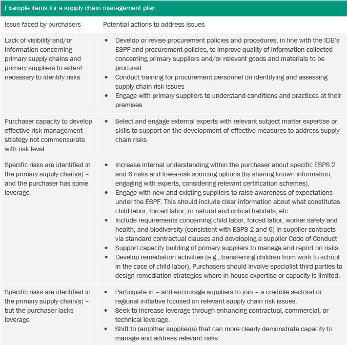 2. Develop appropriate supply chain management plans to mitigate and address environmental and social risks and any adverse impacts. The plan should set out specific steps and measures to be taken by the purchaser (and/or other functions within the relevant implementing agent) to address the risks identified during the initial supply chain risk mapping. The combination of risk severity and purchaser leverage will help determine what mitigation or other measures are feasible. However, implementing agencies should be able to demonstrate reasonable efforts to address all significant supply chain risks identified (see below for some examples of issues faced when preparing the SCM plan).