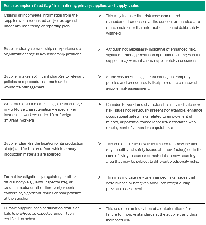 3. Monitor and report on environmental and social supply chain issues and risks. Once the management plan is in place, we need to ensure it is being implemented adequately through effective supply chain monitoring, which requires a combination of indicators to assess evolving risk profiles. Indicators should include qualitative and quantitative measures and be tailored to the supply chain context and broad risk profile in question. Below you will find some examples of “red flags” you can find when monitoring supply chains.