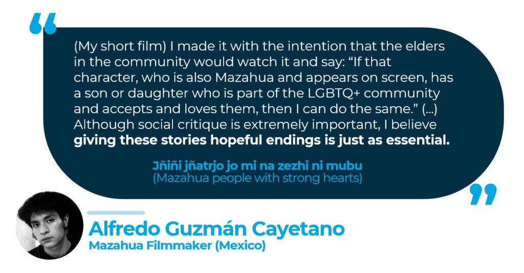 “Going to the movies is still an investment that excludes many people—it’s a big expense for families. I didn’t get close to cinema until I was 12, when my sister started taking us. I grew fond of it, especially when a film came out with a soundtrack in Mazahua, my community’s language (…) That’s when I started seeing more Indigenous filmmakers.” — Alfredo Guzmán Cayetano, Mazahua filmmaker from Mexico