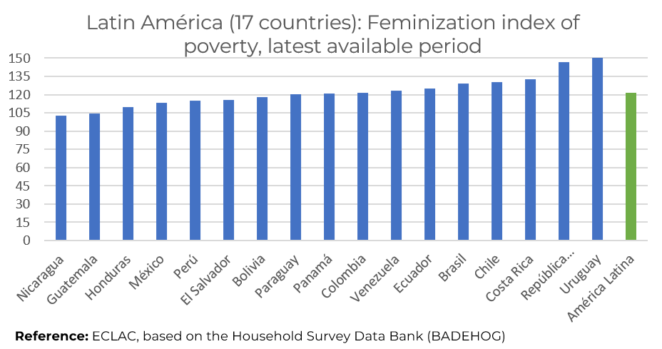 In line with this, ECLAC's feminization index in poor households, which compares the number of men and women aged 20 to 59 in poverty, shows that in the region, the percentage of women in poverty tends to be higher than that of men of the same age. These gaps in poverty incidence are even greater if only women of childbearing age are considered. Additionally, female-headed households, especially single mothers, are more likely to be poor due to lower labor income, higher care burdens, and structural barriers to economic opportunities.
