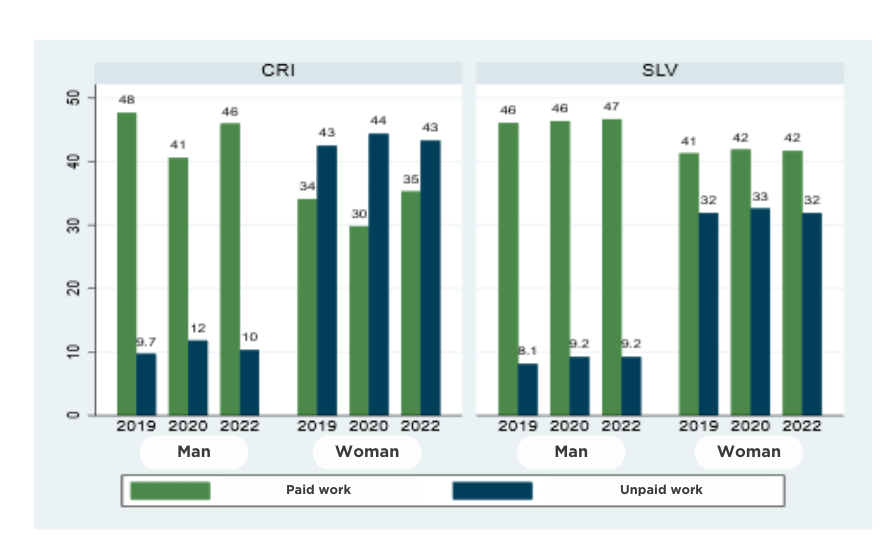 Despite these advances, unequal co-responsibility in household chores still persists. In 2019, working-age women with children dedicated, on average, 4.2 times more hours per week to unpaid domestic work than men. This reality was similar in both Costa Rica and El Salvador. While this gender gap decreased to 3.8 in 2022, it still represents a significant burden for women.