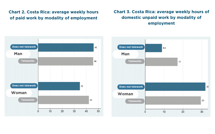 Source: ENAHO (Costa Rica) and EHPM (El Salvador). Heads of household in a couple, between 15 and 65 years of age and who have children. Unpaid work includes only household chores and care.Teleworking: a key factor in bridging the gap
