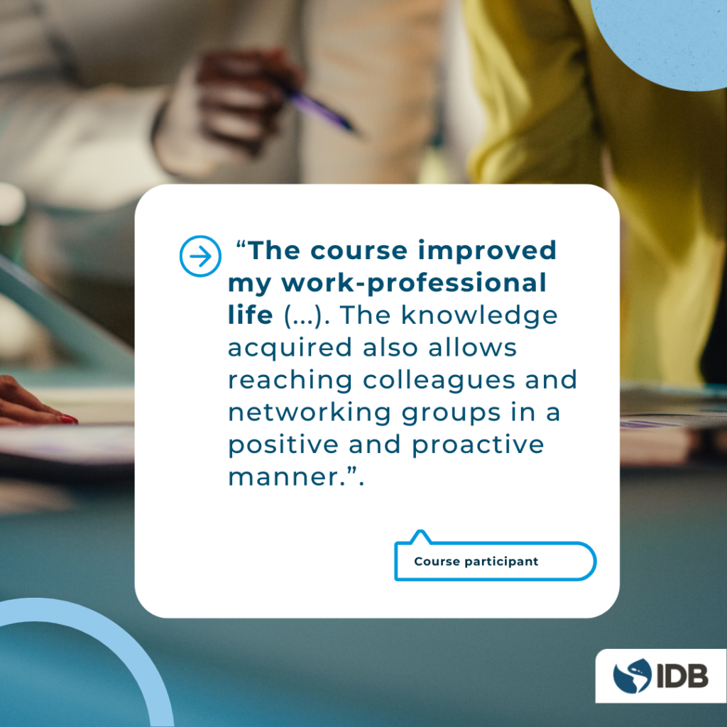 At the beginning of 2020, I assumed the leadership of the Gender and Diversity Division of the IDB. Upon my arrival, I found that the team had developed an interesting leadership training program aimed at women professionals working in the public and private sectors. The course offers tools to analyze one's own leadership skills, as well as to strengthen some key areas. Some examples of these contents are building networks, communication skills focused on persuasion and influence, or resilience. In its original version, the course had been offered in person to groups of women from some countries in the region. Each edition of the course had the capacity to reach small groups.