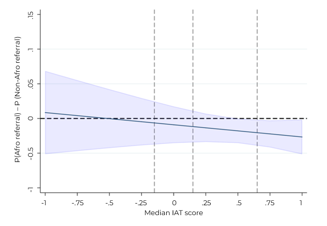 Differential probability to refer an Afro-descendant CV vs. anon-Afro-descendant CV by the median IAT score of job center.