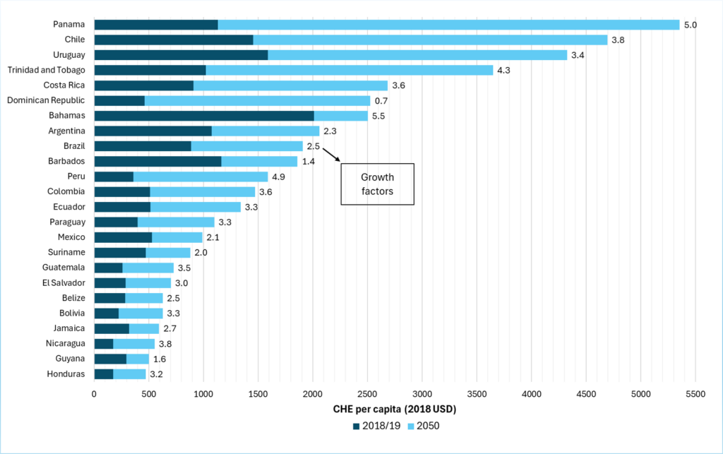 The first paper projects that health spending will rise quickly. By 2050, almost all Latin American countries are expected to at least double their per capita current health expenditures (CHE) and for some countries in the Caribbean, growth will be more than double. For example, per-capita health expenditure in Chile is projected to increase 3.4 times by 2050, while in Belize, the projected growth factor is 2.5.