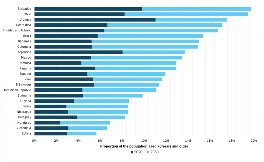 In addition, population aging and the growing importance of chronic diseases are reshaping health needs in the region. Latin America and the Caribbean is undergoing one of world’s fastest demographic transitions: The second paper shows that by 2050, the proportion of people aged 70 and older is expected to double or even triple in most countries of the region. Meanwhile, non-communicable diseases (NCDs) in Latin America and the Caribbean accounted for 48–80% of the total disease burden (IHME, 2022) and are likely to become more important in the future.