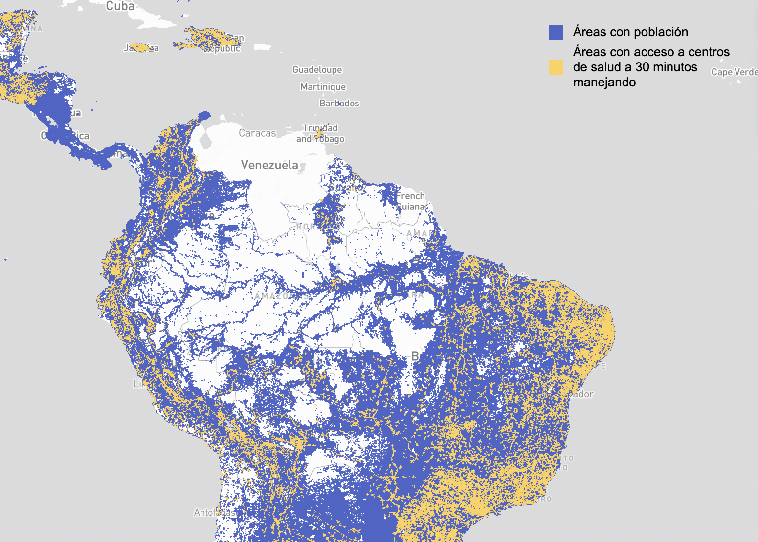 Here we can see in orange the areas whose population must drive at least 30 minutes to reach a health center: out of a total of 586 million people, about 55 million or 9.4% -equivalent to almost the entire population of Argentina.