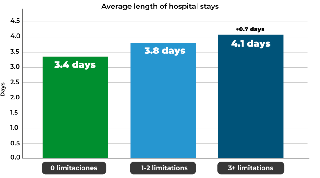 The average length of stay for individuals with one or two limitations in basic activities averages 3.8 days—almost half a day longer than those without limitations. For those with three or more limitations, the expected stay is 4.1 days, an increase of about 0.7 days compared to those with no limitations and of 0.3 days compared to those with only one limitation. Although the average difference in hospital days between individuals with and without functional limitations may appear modest—often less than a single day—its implications are meaningful.