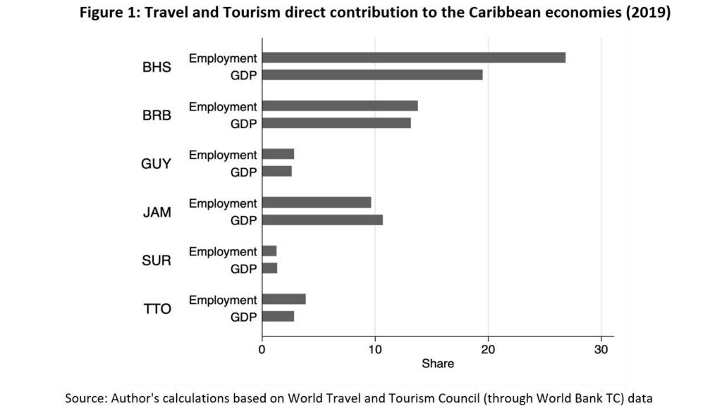 Due to the global collapse in demand, the Caribbean region is facing a significant decline in the exports of goods and services, as well as remittances. This is particularly worrisome for CCB countries given their economic structure. In The Bahamas, Barbados, and Jamaica, the share of tourism in GDP is between 10 and 20 percent, much higher than the world and medians for the Latin America and the Caribbean (LAC), and its direct contribution to employment is even more significant (see Figure 1). Besides, the collapse in commodity prices, especially the shock to oil, has significantly decreased the terms of trade and tax revenues of the commodity-driven economies in Guyana, Suriname, and Trinidad and Tobago.