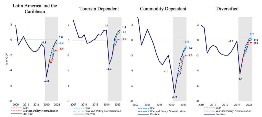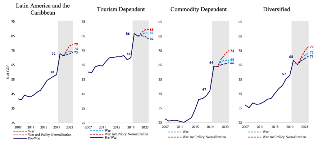 However, tighter financial conditions and higher depreciation will lead to higher debt levels both in the war and in the war and policy normalization scenarios. For countries dependent on tourism, the war could change the debt’s downward path projected in the medium term. And last, for diversified economies, the shock in oil prices could increase debt levels as much as 6 percentage points on average by 2024 under the most aggressive scenario.