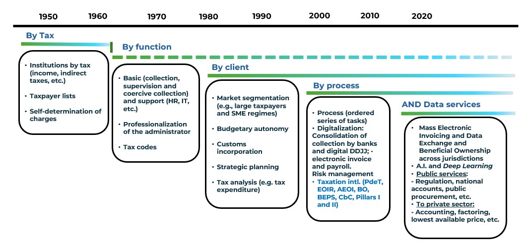This enormous accumulation of information on taxpayers is bringing administrations closer to data centers and economic intelligence, expanding the business lines developed over decades and, therefore,generating changes in the institutional arrangements to fulfill these functions (Figure 1).