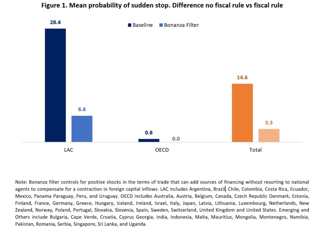 As shown in Figure 1, on average, implementing a fiscal rule reduces the probability of a sudden stop by about 14 percentage points. This effect is larger than in LAC emerging market economies, in which this probability is reduced by 28 percentage points, than in OECD’s economies where it is 0.8 percentage points.