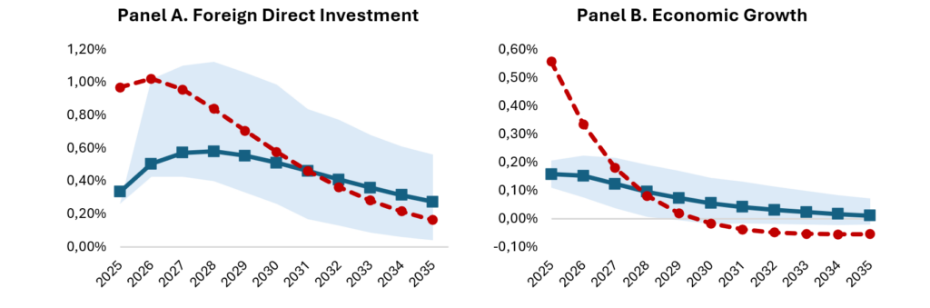 Our simulations indicate that clearly signaling no major changes to capital taxation can lead to a short-term increase of 1.5 percentage points in private investment, a 1 percentage point boost in foreign direct investment (FDI), and a 0.5 percentage point rise in GDP growth (see Figure 3 – red lines).