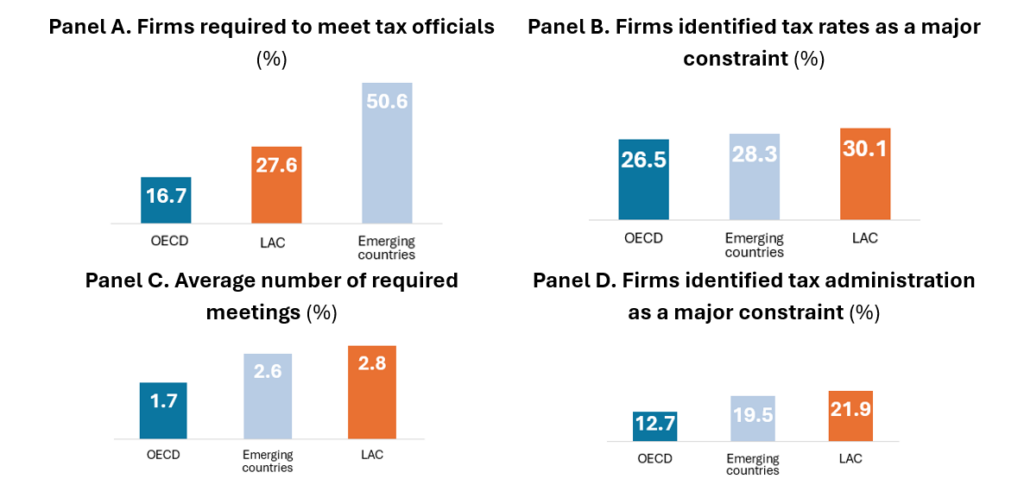In LAC, 27.6% of firms report having to meet with tax officials—significantly above the OECD average of 16.7%—and they do so nearly three times on average, compared to just 1.7 times in OECD countries (Figure 4). These excessive interactions reflect a tax system with high administrative friction, consuming time and resources while increasing the scope for discretion. Unsurprisingly, 30% of firms in LAC view tax rates as a significant obstacle, and nearly 22% cite tax administration itself as a key constraint, well above the levels observed in advanced economies.