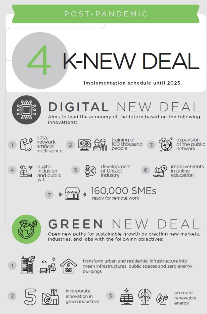 What is the K-New Deal? It is a strategy divided in two parts, the “Digital New Deal” and the “Green New Deal” with an implementation schedule until 2025. The first of them aims to lead the economy of the future based on innovation, and it will receive an investment of 13.4 trillion won (0.7% of GDP) by 2022 and will create 330 thousand jobs. A part will be invested to strengthen the DNA (in reference to the data, network and Artificial Intelligence sectors); supporting the training of 100 thousand people in software, expansion of the 5G public network and the use, dissemination and construction of data. It will also invest in digital inclusion and for a digital safety net; having “wifi” services in public spaces and to support the development of the “untact” industry. The government will provide digital infrastructure for education at all levels, primary and secondary, while supporting improvements in online education through universities and job training spaces. There will be 160,000 SMEs that will be provided with equipment that allows remote work.