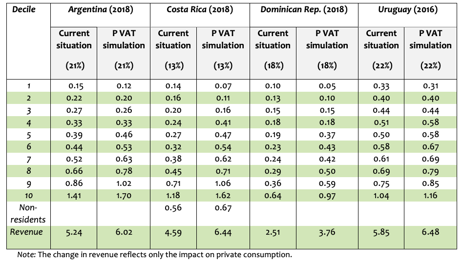 In contrast to the “universal” solution, P VAT makes it possible to preserve, and even increase, the revenue from LAC’s main tax pillar, aiding fiscal consolidation and compensating the most vulnerable sectors of the population. This is readily apparent in the simulations outlined in Table 3, which show that the incidence of VAT would be proportional to income level. We estimate revenue and equity impacts exclusively on private household consumption.