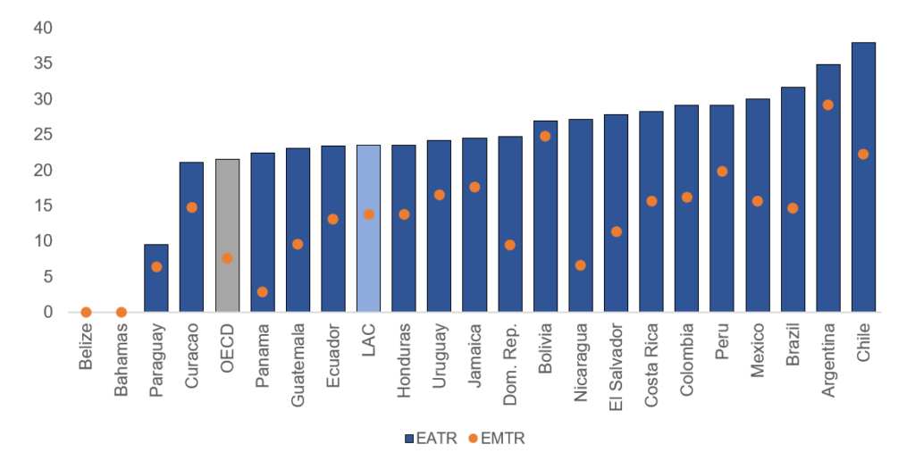 At the individual country level, Argentina, Brazil, and Chile have the highest EATR of the 89 jurisdictions analyzed. Additionally, Colombia, Mexico and Peru are among the ten countries with the highest EATR. In the case of EMTR, Argentina heads the list, and Bolivia, Chile, Jamaica and Peru appear among the top ten (see Figure 3 for LAC countries and Figure 6 of the study, for the 89 jurisdictions considered).