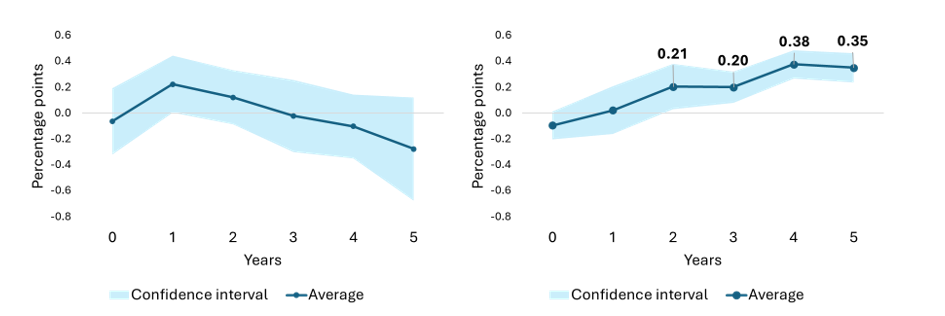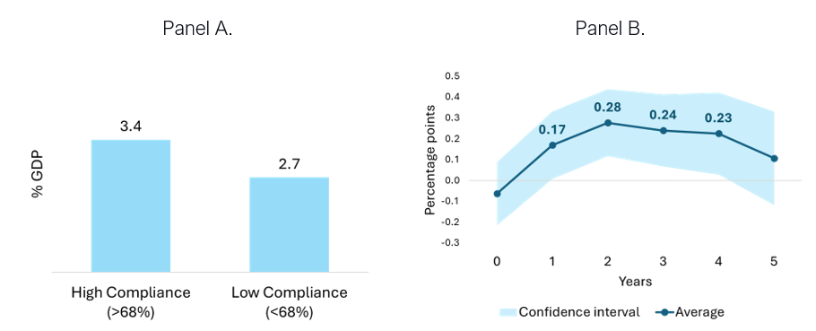 As shown in Figure 1, Panel B, compliance benefits become even more substantial over time: two years after compliance, public investment tends to increase by up to about 0.3 percentage points of GDP. This suggests that while fiscal rules do not dictate investment levels, compliance creates the fiscal space necessary to sustain or expand public investment.