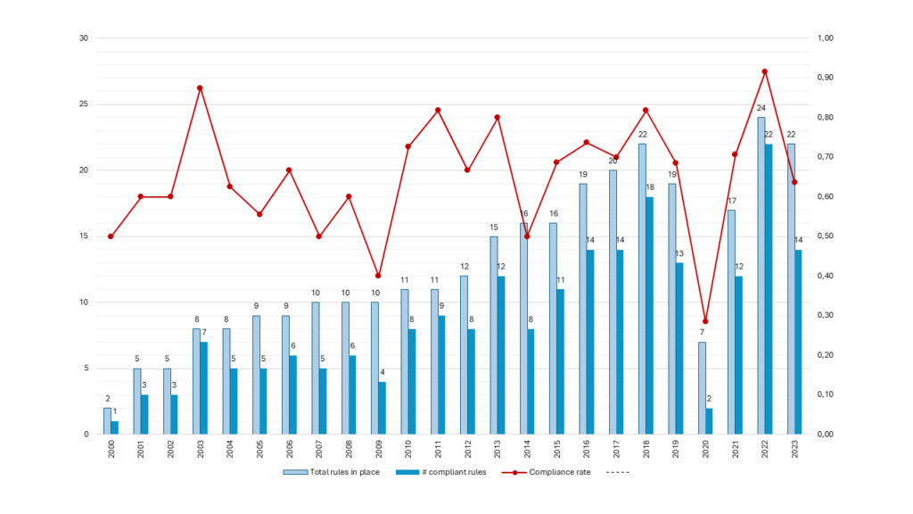 Source: Ulloa-Suarez and Valencia, 2024. Note: the light blue bars represent the total fiscal rules in place considering that a country could have implemented more than one rule in a given year. The dark blue bars represent how many rules of the implemented ones were complied. The red trajectory represents the compliance rate measured as the total number of rules complied divided by the total number of rules implemented. The horizontal dotted line represents the weighted average compliance rate over 2000-2023.