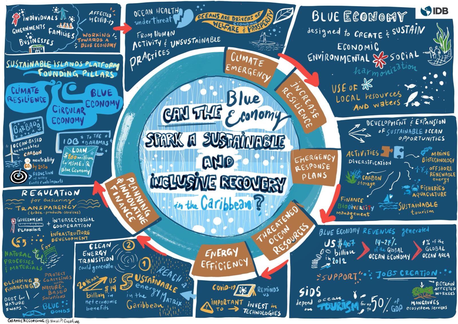 The IDB’s Climate Change Division Chief, Graham Watkins, moderated the event and highlighted the IDB’s commitment to support countries assemble recovery plans from the pandemic. Although there are different interpretations of the term Blue Economy, it is rooted in the idea of the sustainable use of oceans, resolving the waste issue, inclusiveness and has a leading part to play to helpachieve sustainable recovery.