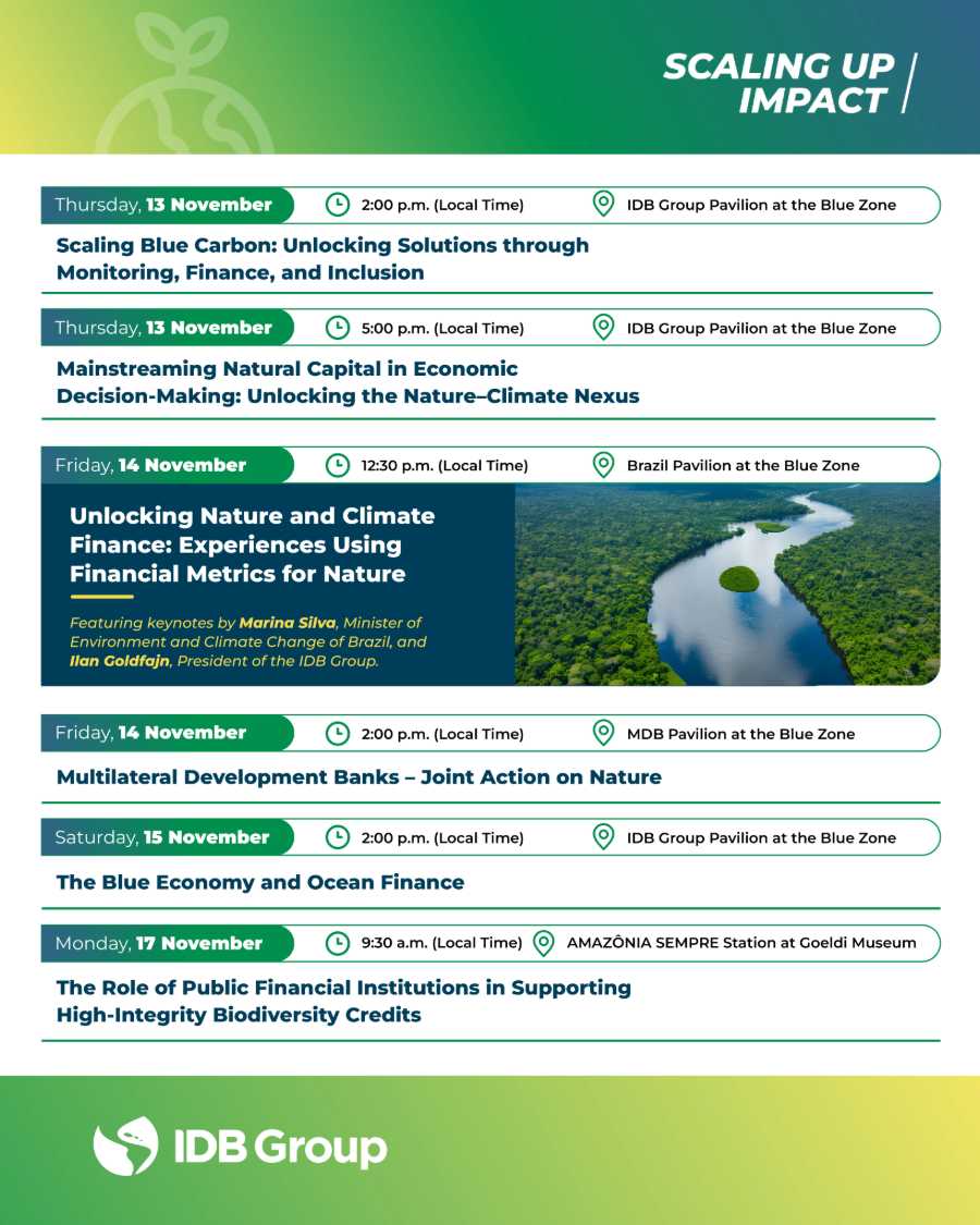 Join us at COP30 to explore how the IDB Group is advancing nature-positive solutions across Latin America and the Caribbean.