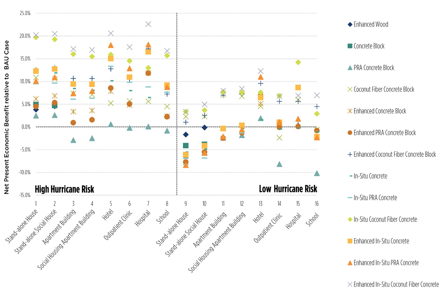 As shown in the graphic above, in the High Hurricane Risks area the economic benefit of using resilient materials and construction methods is positive for almost all of their combinations, with only a few exceptions, reaching up to 22% of savings compared to a building typically built in the Caribbean. On the other hand, in the Low Hurricane Risk area the economic benefit was much lower, showing a negative economic benefit relative to the BAU case in some cases, since the initial investment for building resilient construction is higher and the risk of damages is lower.