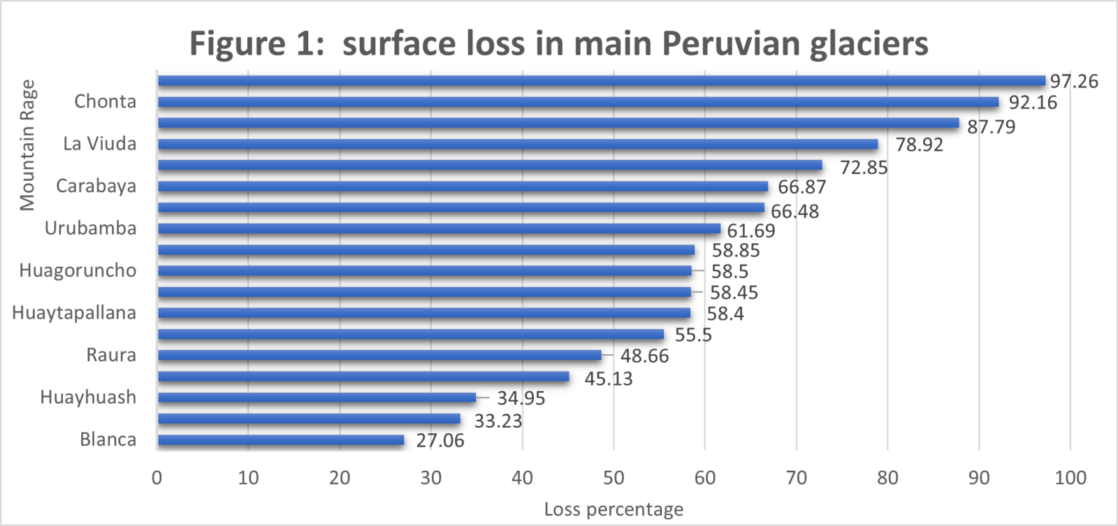 The scientific consensus is clear regarding the seriousness of the problem in the Andes, both because of its intensity and its speed. Observed warming in the Peruvian Andes caused, on average, 22 percent of glaciers to be lost in the last 30 years. These losses have differentiated manifestations within the country: the mountain ranges that have lost the most glaciers since the measurements began are La Blanca (169), Huayhuash (66) and Central (45); however, it is those of Chila, Chonta and Huanzo that have lost the most glacier surface (Figure 1). The El Barroso and Volcánica mountain ranges have already completely lost their glaciers (La República, 2022).