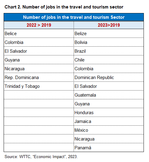 - Regarding estimates for 2023, the WTTC expects a somewhat improved pace of recovery at the employment level since it estimates that 14 of the 26 borrowing countries will ensure that their travel and tourism sector generate the same or a more significant number of jobs in 2023 than in 2019 (54% of countries, 14 of the 26).