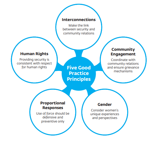 International good practices on this topic (such as those contained in the IFC’s Good Practice Handbook) are based on the idea that providing security and respecting human rights can and should go hand in hand. Therefore, it is necessary to implement policies that ensure that the response to any threat is proportional and that the provision of security is carried out appropriately. For this, it is important to keep in mind the five principles described in the following image.