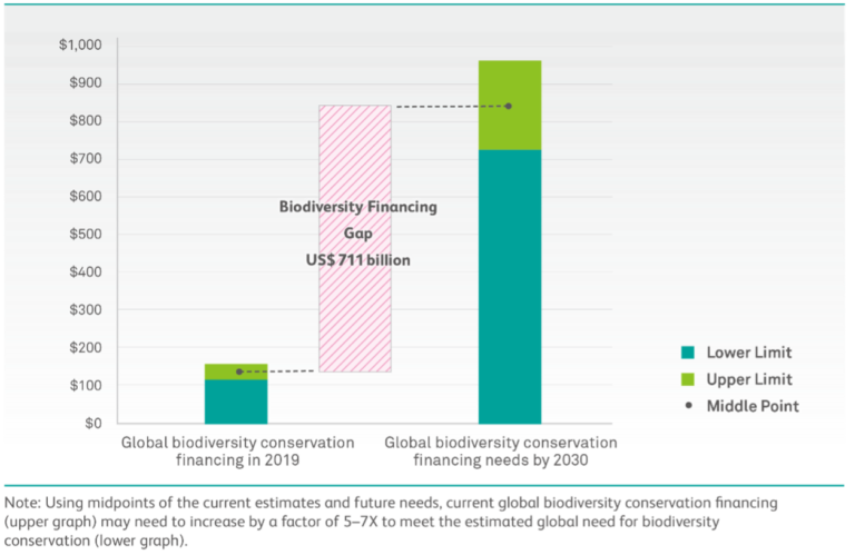 The biodiversity financing gap (Photo: Paulson Institute)There has, so far, been a lack of adequate mechanisms that drive spending towards natural capital, and this has proved to be a major barrier in implementing nature-based solutions.