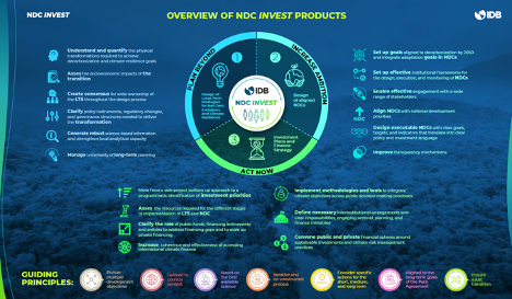 At NDC Invest, we are supporting countries in Latin America and the Caribbean to accelerate climate action and achieve the goals of the Paris Agreement through transformational climate policy and finance. We do it through three main products developed to achieve net-zero emissions, climate resilience and sustainable development, which we present in detail in our latest report “NDC Invest: Supporting transformational climate policy and finance”: