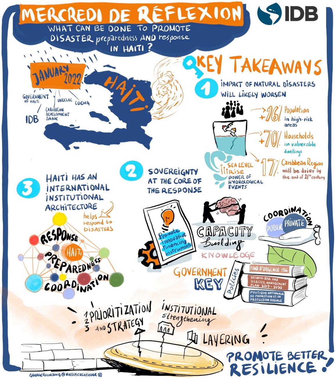 As we contemplate these issues in response to the crises that are arising, we conclude that institutional strengthening, prioritization and layering will be key in promoting better disaster preparedness and response in Haiti going forward. To promote better resilience and response, significant efforts will be needed to update the institutional and policy framework, but this will have to come hand in hand with further capacity building and further coordination of international support. These mechanisms can provide different layers of support and protection to ensure better resilience and a better response become a reality.