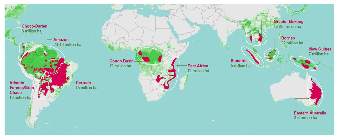 On the 11 deforestation fronts shown on the map, the greatest forest losses are expected to occur (2010–2030). Four of them are in Latin America. Source: WWF Living Forest Report: Chapter 5.