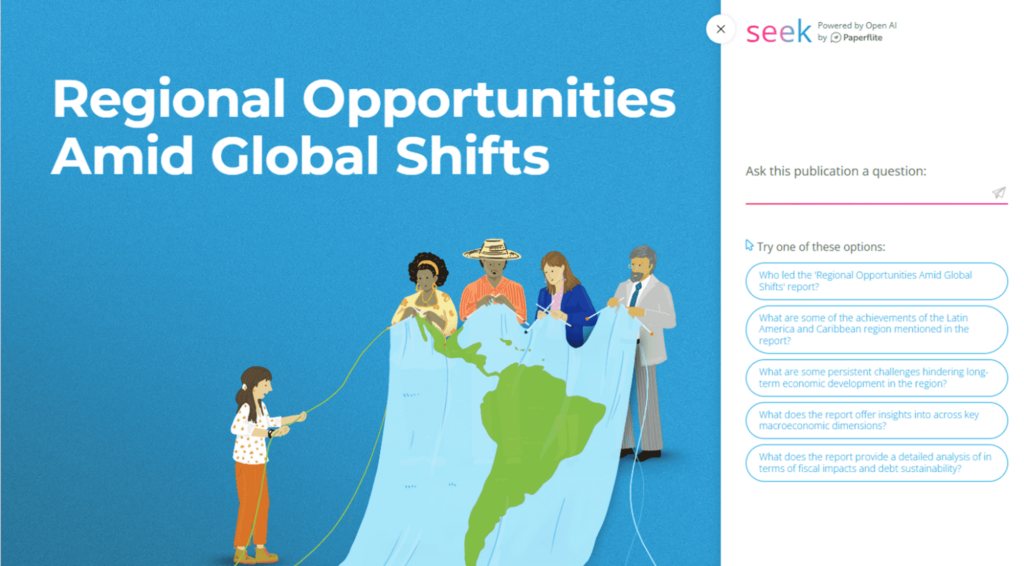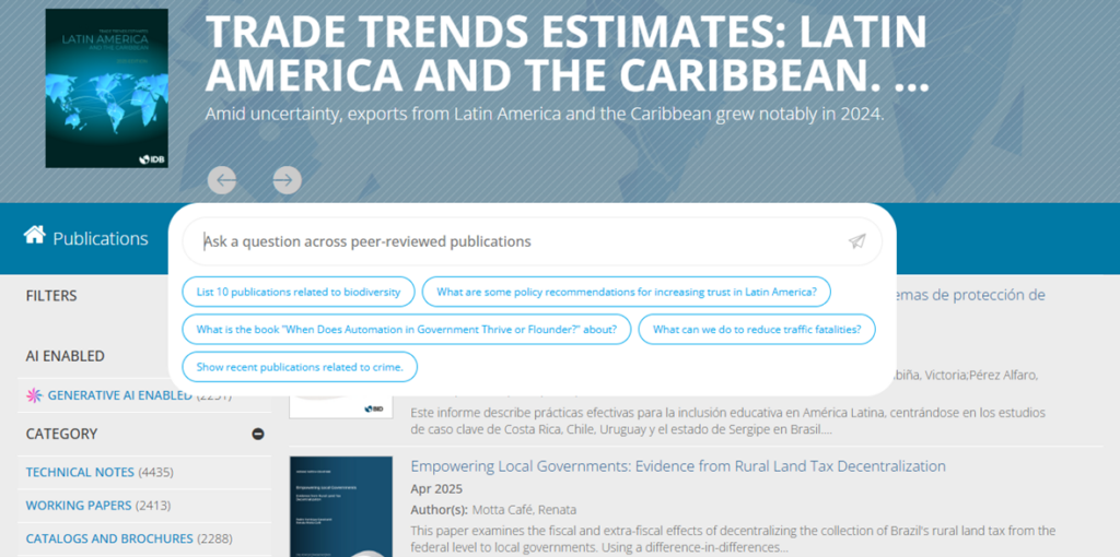 In support of our commitment to open knowledge and aligned with our institutional emphasis on knowledge as a driver of impact, we’ve launched a major new feature that helps you explore the IDB’s publications catalog in seconds. We’ve expanded the generative AI functionality so that you can ask a question and get answers pulled from thousands of peer-reviewed IDB publications all at once. That’s decades of insights, instantly at your fingertips. Simply ask a question and receive an answer based on the research in our Publications Catalog, complete with references to the source documents and links so you can keep reading in depth.