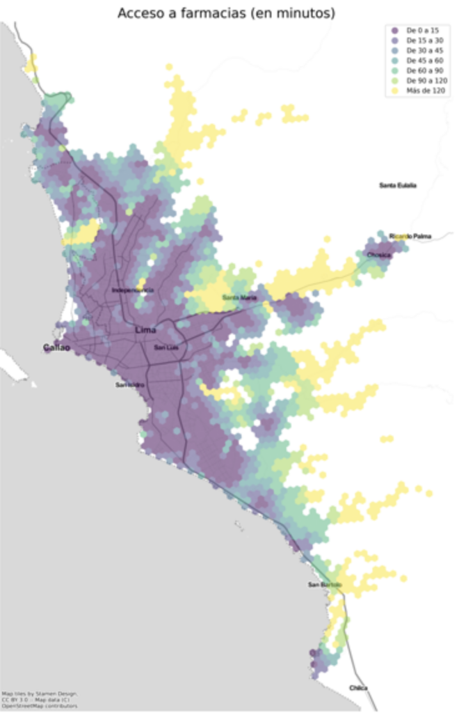 UrbanPy was used during the early days of the COVID-19 pandemic in support of the City of Lima, Peru to prioritize emergency assistance.This map showcases UrbanPy’s calculations for travel times to the nearest pharmacy in the environs of Lima, Peru: