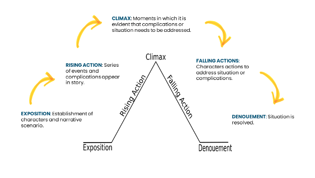 - 3.- Selection of a storytelling model: The learning experts on the course development team selected Freytag's pyramid of dramatic structure as the most appropriate storytelling model to connect the problem-based learning activities within the course: