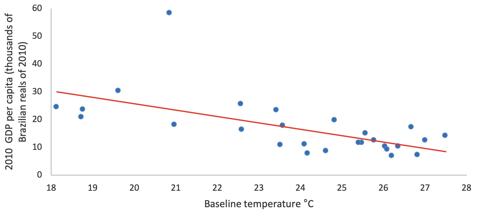 The same logic can be applied within countries to show that we can expect rising temperature to exacerbate inequality within countries as well. In many countries, poorer areas have higher temperatures. As one example, Figure 2 shows that there is a negative correlation between baseline temperature and per capita GDP of Brazilian states. This implies that poorer areas are likely to experience the largest negative impacts of rising temperatures, exacerbating inequality across Brazilian states.Figure 2: GDP Per Capita and Baseline Temperature of Brazilian States
