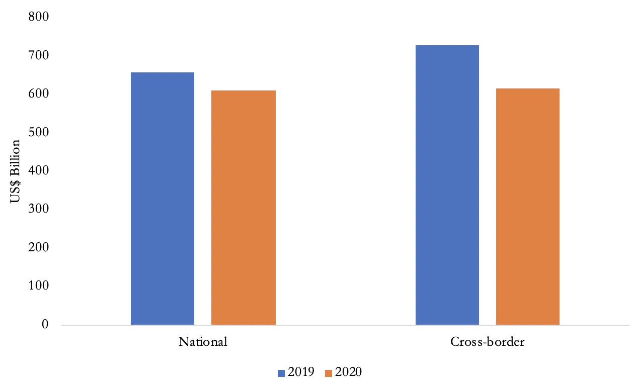 The Financial Times recently reported a sharp drop of lending from US banks to European countries.[1] But this is best characterized as part of a wider deglobalization process. As national authorities urge banks to lend to firms within their borders and provide liquidity and guarantees for them to do so, global players are becoming less global. The syndicated loan market is an important source of finance for large firms, big infrastructure projects and even some governments around the world. Moreover, the trends in this market reflect those in cross-border credit generally. The total global syndicated loan market was about US$4.5 trillion in 2019. Banks lend in syndicates to tap global liquidity, to spread risk, earn fees and to manage their capital allocation. But in recent months, syndicated lending has declined significantly. Comparing the volume of syndicated loans extended from January to April of 2020 to that from January to April of 2019, the decline in cross-border lending has been much steeper than that within-borders. Cross border syndicated loans extended in the first four months of 2019 amounted to over US$728 billion whereas just US$615 billion was extended in the same period in 2020, a reduction of 15%. Lending within national borders fell by about 7%. Figure 1 compares syndicated lending within national borders to cross-border syndicated lending for the two periods.