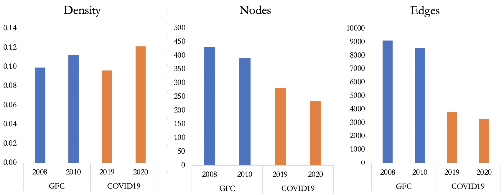 Large shocks to the cross-border syndicated loan market pose a serious threat, as they can propagate through the lender network, impacting the stability of the international financial system and further reducing credit flows to emerging economies. Network models from the academic literature suggest both resilience and fragility in the global financial system. In a forthcoming paper (Conesa, Lotti and Powell 2020), we find evidence of both. Focusing on cross-border syndicated lending to emerging and developing countries since 1993, we find that shocks propagate in the cross-border lending network through co-lending relationships, driven mostly by large players who occupy central positions in the network – typically the large global banks. At the same time, the network is resilient to shocks to banks that are located on its fringes and have limited co-lender relationships. The global financial crisis provoked changes in the network (Figure 3). During 2009 and 2010, it shrank with fewer banks (nodes, in network terminology) lending and fewer overall connections between them (known as edges in network parlance). But for those banks that did continue to lend, the density of the network increased (this density being a measure of the number of co-lender relations between the banks that actually remained as lenders). However, after 2010, as more banks started to lend again, density declined, that is, the network became less complete in terms of possible connections among banks. The main global banks became less global and new players entered, such as China’s official banks. We find results consistent with the idea that this reduction in density may have increased resilience to an average shock, in accordance with Acemoglu et al. (2015).Figure 3. Density, Nodes and Edges in 2008-10 and 2019-20
